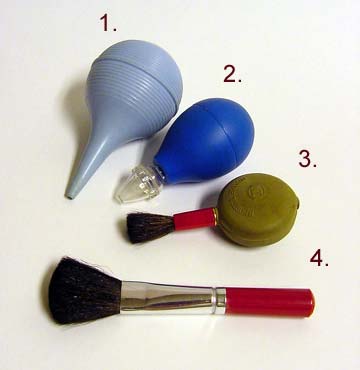 D. Dusting device (brush, ear syringe or canned air). There are numerous devices which you may use to clean your negatives. You will need either canned air (not pictured) or a blowing device to clean loose duct off your negatives. An inexpensive option for this purpose is to purchase an ear syringe (1 or 2 ). These are usually available at your local drugstore. Some photography stores sell combination blower / brushes ( 3 ) - unfortunately the blowers on these devices are often too weak to be of much practical use. A soft camel-hair brush (4) which comes with cosmetics but which has not been used can be very effective for dislodging dust from your negatives.